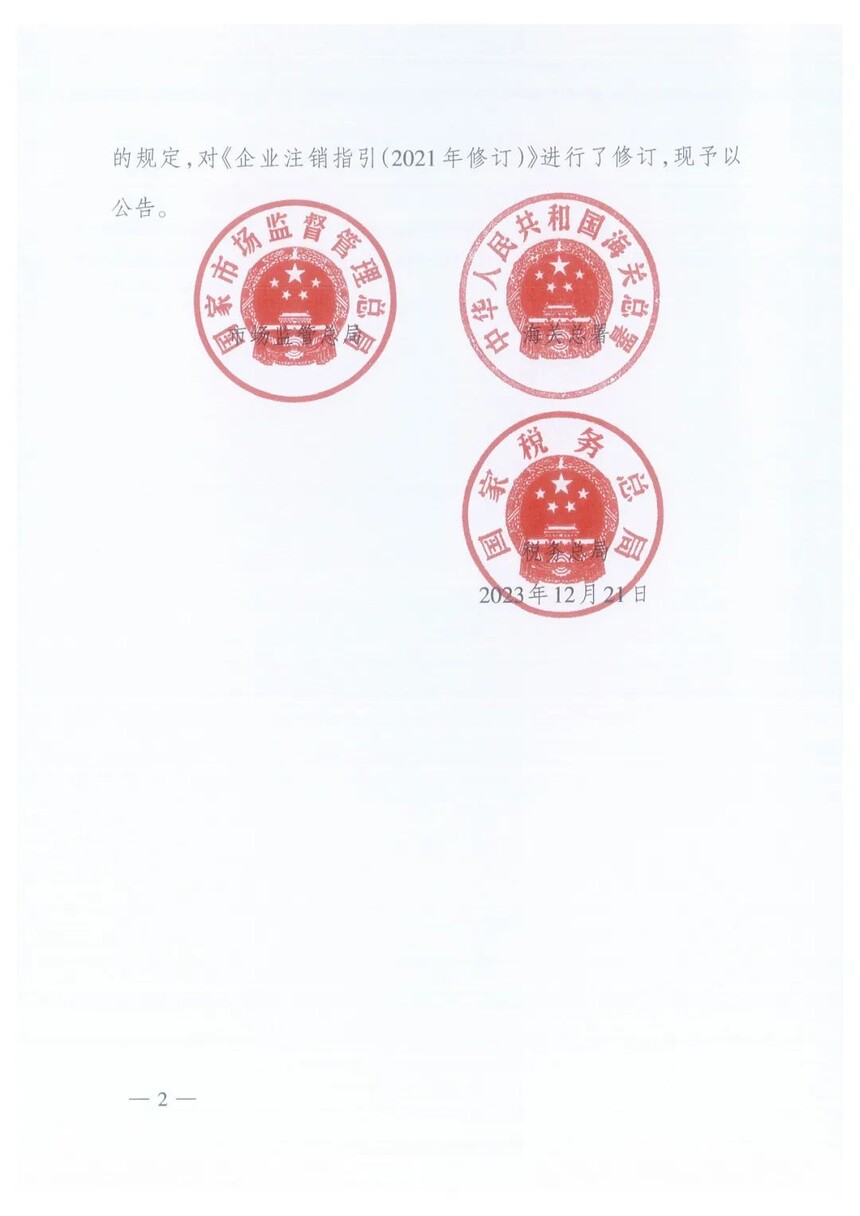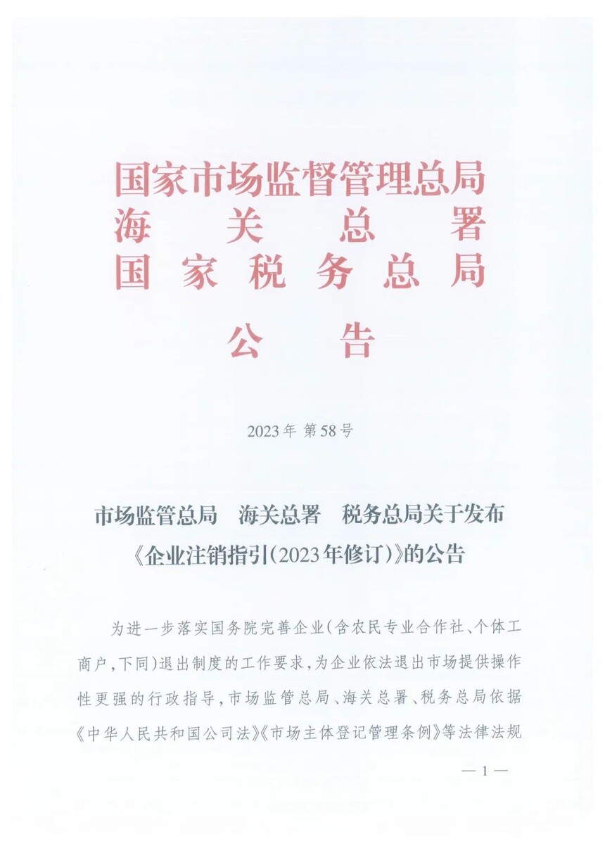 最新!市场监管总局等三部门发布《企业注销指引(2023年修订)》!(附解读)市场监管总局 海关总署 税务总局关于发布《企业注销指引(2023年修订)》的公告 市场监管总局 海关总署 税务总局公告2023年第58号 为进一步落实国务院完善企业(含农民专业合作社、个体工商户,下同)退出制度的工作要求,为企业依法退出市场提供操作性更强的行政指导,市场监管总局、海关总署、税务总局依据《中华人民共和国公司法》《市场主体登记管理条例》等法律法规的规定,对《企业注销指引(2021年修订)》进行了修订,现予以公告。 市场监管总局 海关总署 税务总局 2023年12月21日 企业注销指引(2023年修订) 一、企业退出市场基本程序 通常情况下,企业终止经营活动退出市场,需要经历决议解散、清算分配和注销登记三个主要过程。例如,按照《公司法》规定,公司正式终止前,须依法宣告解散、成立清算组进行清算、清理公司财产、清缴税款、清理债权债务、支付职工工资、社会保险费用等,待公司清算结束后,应制作清算报告并办理注销公司登记,公告公司终止。 二、企业注销事由 企业因解散、被宣告破产或者其他法定事由需要终止的,应当依法向登记机关申请注销登记。经登记机关注销登记,企业终止。企业注销依法须经批准的,应当经批准后向登记机关申请注销登记。 (一)解散 1.自愿解散。指基于公司股东会或者股东大会、非公司企业法人出资人(主管部门)、合伙企业合伙人、个人独资企业投资人、农民专业合作社(联合社)成员大会或者成员代表大会、个体工商户经营者,或者分支机构隶属企业(单位)的意愿进行解散如公司解散情形包括:公司章程规定的营业期限届满或者公司章程规定的其他解散事由出现;股东会或者股东大会决议解散;因公司合并或者分立需要解散等。合伙企业解散情形包括:全体合伙人决定解散;合伙协议约定的解散事由出现;合伙期限届满,合伙人决定不再经营等。个人独资企业解散情形包括:投资人决定解散等。农民专业合作社(联合社)解散情形包括:成员大会决议解散;章程规定的解散事由出现等 2.强制解散。通常分为行政决定解散与人民法院判决解散。行政决定解散,包括依法被吊销营业执照、责令关闭或者被撤销。人民法院判决解散,按照《公司法》规定,因公司经营管理发生严重困难,继续存续会使股东利益受到重大损失,通过其他途径不能解决的,持有公司全部股东表决权百分之十以上的股东,请求人民法院解散公司的情形。 (二)破产 企业被宣告破产是指根据《企业破产法》等规定企业不能清偿到期债务,并且资产不足以清偿全部债务或者明显缺乏清偿能力的,经人民法院审查属实,企业没有进行和解或重整,被人民法院宣告破产。 三、企业清算流程 依法开展清算是企业注销前的法定义务。《民法典》规定,法人解散的,除合并或者分立的情形外,清算义务人应当及时组成清算组进行清算。非法人组织解散的,应当依法进行清算。清算的重要内容是企业清理各类资产,清结各项债权债务。清算的目的在于保护债权人的利益、投资人的利益、企业的利益、职工的利益以及社会公共利益。法人的清算程序和清算组职权,依照有关法律的规定;没有规定的,参照适用公司法律的有关规定。 (一)成立清算组。《民法典》规定,法人的董事、理事等执行机构或者决策机构的成员为清算义务人。法律、行政法规另有规定的,依照其规定。清算义务人未及时履行清算义务,造成损害的,应当承担民事责任:主管机关或者利害关系人可以申请人民法院指定有关人员组成清算组进行清算。 1.公司清算组。公司在解散事由出现之日起15日内成立清算组,负责清理公司的财产和债权债务。有限责任公司的清算组由公司股东组成,股份有限公司的清算组由董事或者股东大会确定的人员组成。逾期不成立清算组进行清算的,债权人、股东、董事或其他利害关系人可以申请人民法院指定有关人员组成清算组进行清算。清算组的选任在遵守法律法规强制性规定的同时应充分尊重公司意愿,公司章程中可以预先确定清算组人员,也可以在章程中规定清算组成员选任的决议方式。对于章程中没有规定或者规定不明确的,股东会或者股东大会可以通过普通决议或者特别决议的方式选任清算组成员。有限责任公司清算组成员在公司股东中选任,既可以是全体股东,也可以是部分股东股份有限公司清算组成员可以是全体董事,也可以是部分董事或者由股东大会确定清算组成员。 清算组的选任,公司可以结合规模大小和清算事务工作量的多少,充分考虑能否便于公司清算的顺利进行和迅速完结,以及以较低清算成本完成清算事务。鼓励熟悉公司事务的内部人员以及具备审计、财会专业知识的机构、人员担任清算组成员。 清算组成员除可以为自然人外,也可以为法人或者其他组织;成员为法人或者其他组织的,应指派相关人员参与清算。一人有限责任公司的清算组成员,可以仅由该一人股东担任。清算组负责人由股东会或者股东大会在清算组成员中指定。 2.非公司企业法人清算组。非公司企业法人可以由出资人(主管部门)自行或者组织有关人员进行清算。 3.合伙企业清算人。合伙企业解散,应当由清算人进行清算。清算人由全体合伙人担任;经全体合伙人过半数同意,可以自合